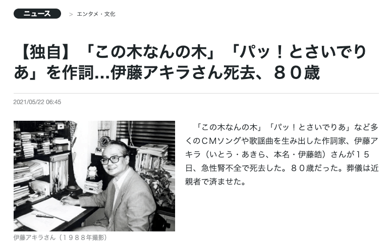 作詞家の伊藤アキラ(いとう・あきら、本名・伊藤 皓)さんが15日、急性腎不全でお亡くなりになっていたそうです、享年80歳。