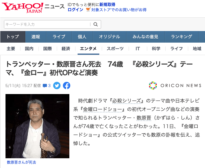 私全然知らなかったんですが、大好きなミュージシャンのお一人であるプロ・トランペッターの数原 晋さんが今月の11日に亡くなられていたんですね?享年74歳だったそうです。近年、ご体調が優れないので第一線からは退いているという噂は聞いていたのですが、まさかお亡くなりになられていたとは・・・死因が書かれていないのでご病気だったとは思いますが、まだまだ若すぎますよね…