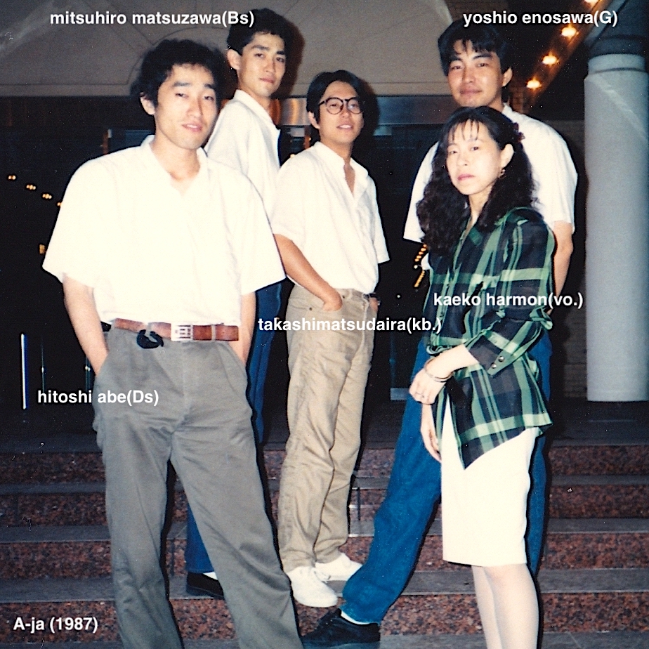 で、そのトップページでもご紹介している、『女性ボーカリスト・プロデュース リメイク第3集』の企画として発表します、『A-ja 1987 SONG BOOK+2 / takashimatsudaira feat. Kaeko Harmon』〜相変わらずタイトル長くてすみません(笑)という作品なんですが、これは私が、文字通り1987年に組んでいたバンド名でして、正式には「彩」という漢字一文字で「A-ja (エイジャ)」と呼んでもらっております。そこでピンと来た方は、中々の”通”、、そうです、これは、スティーリー・ダンが、1977年にABCレコードからリリースした6作目のアルバムのタイトルなんです。一つ違う点と言えば、本家?は『aja』で私たちは「A-ja」でAは大文字の後にハイフン入りです(こだわるところが微妙です)当時バンドのメンバーがみんな好きで、満場一致で決まりました!