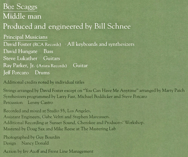 なんてオシャレなジャケットなのでしょう、、、これは1980年に発表された『ミドル・マン (原題:Middle Man)』というアルバムで、エンジニアの名匠ビル・シュネー氏がプロデュースしておりますが、当時のスタジオのトップミュージシャンが参加しておりました。
