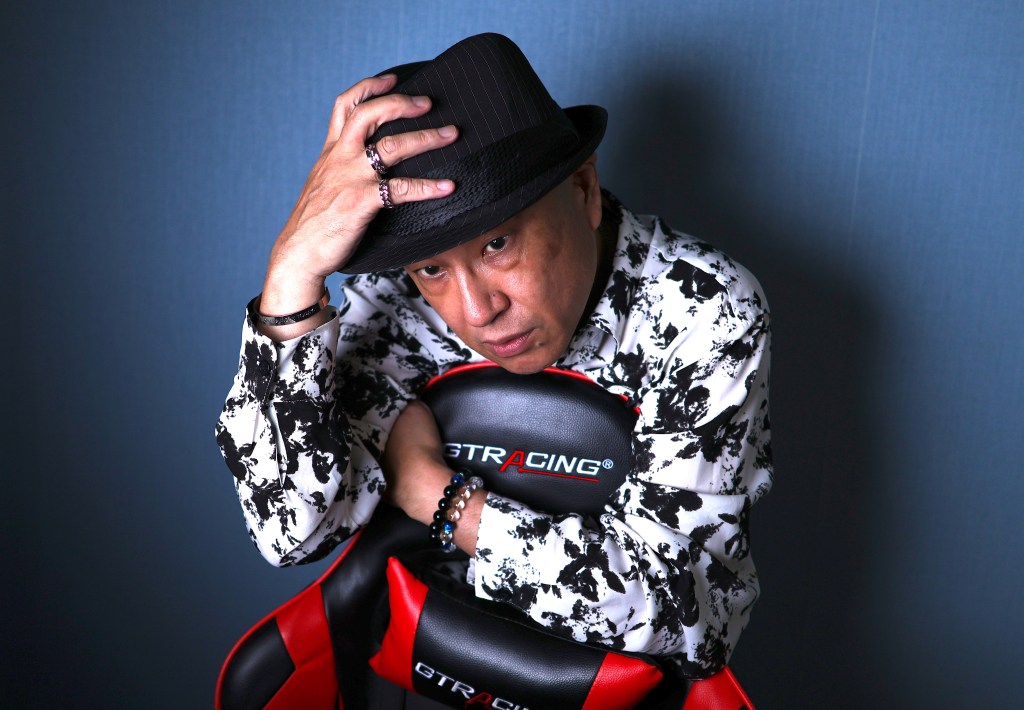 これが全景です。急遽決まったので会議用の事務所で撮影でしたけど、このたまたまそこにあったゲーミングチェアが、なかなかカッコ良かったので2ショットです(笑)こいつに「赤」が入っているので、私はお着替えして撮影しました。